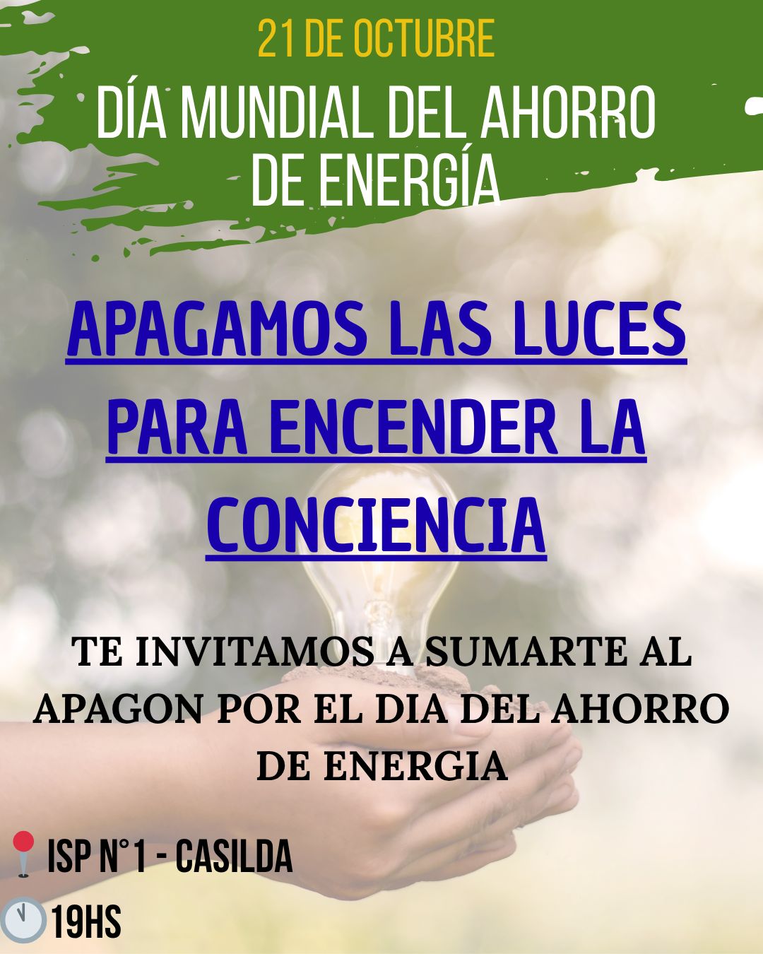 El pasado veintiuno de octubre alumnos/as y docentes de tercer año de la Tecnicatura en Ambiente realizaron una intervención urbana titulada “Apagamos las luces para encender las conciencias” alusiva al Día del ahorro de energía. Dicho evento fue la resultante de un proyecto intercátedra donde participaron las Profesoras: Samanta Arnau, Sabrina Aguilar, Michelle Bourguignon y Marcela Monterubbiano. ¡Felicitaciones a todos/as!